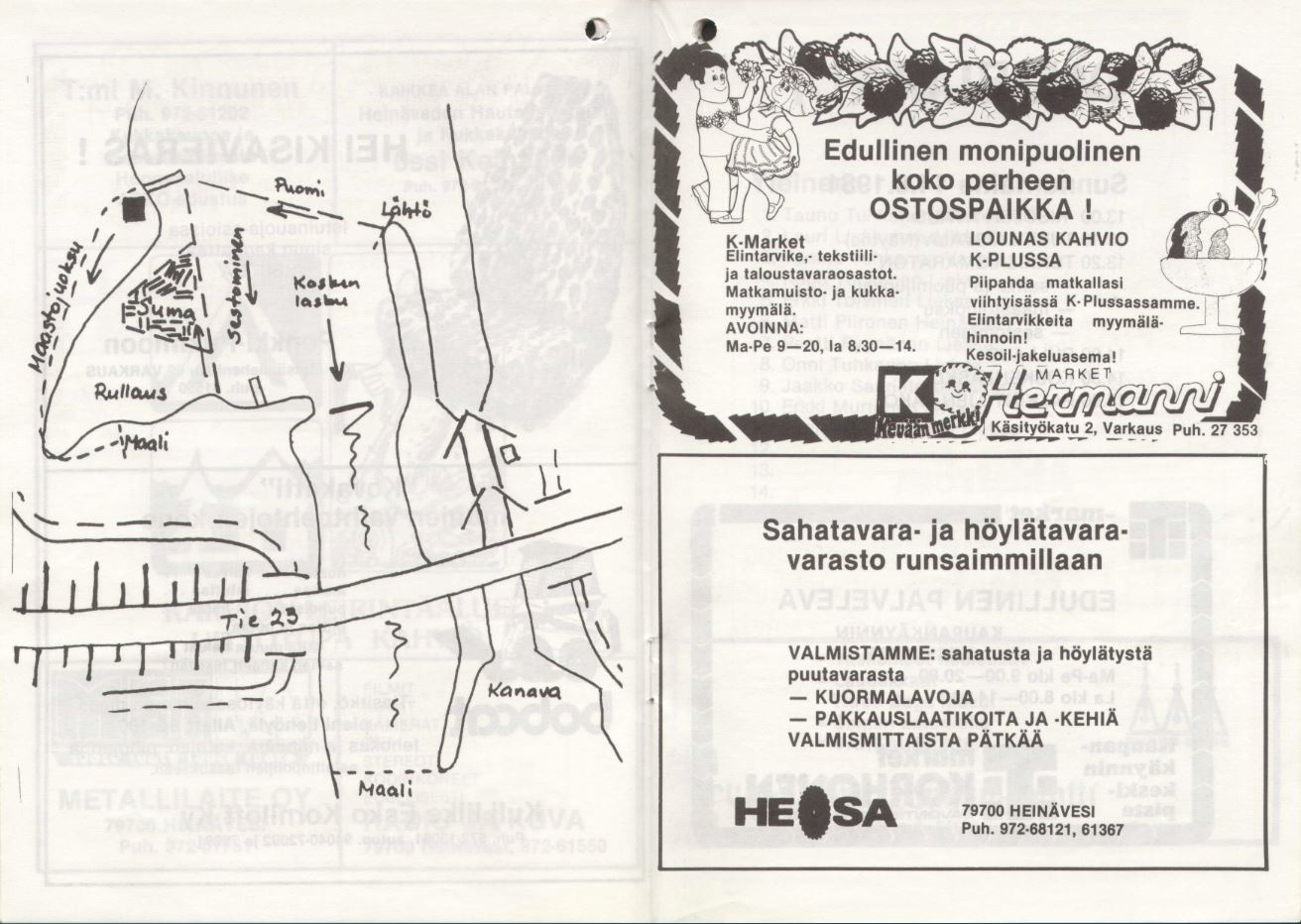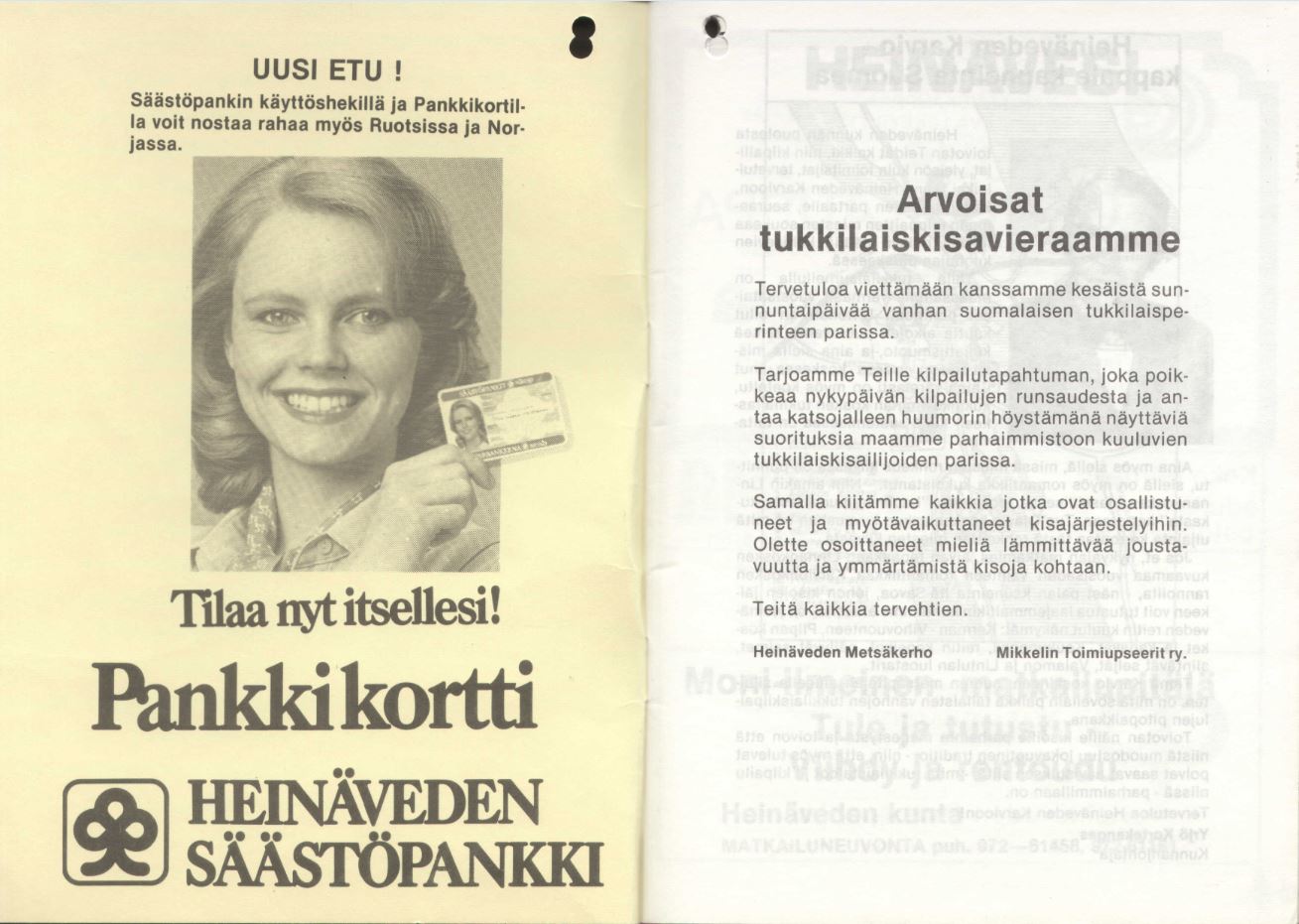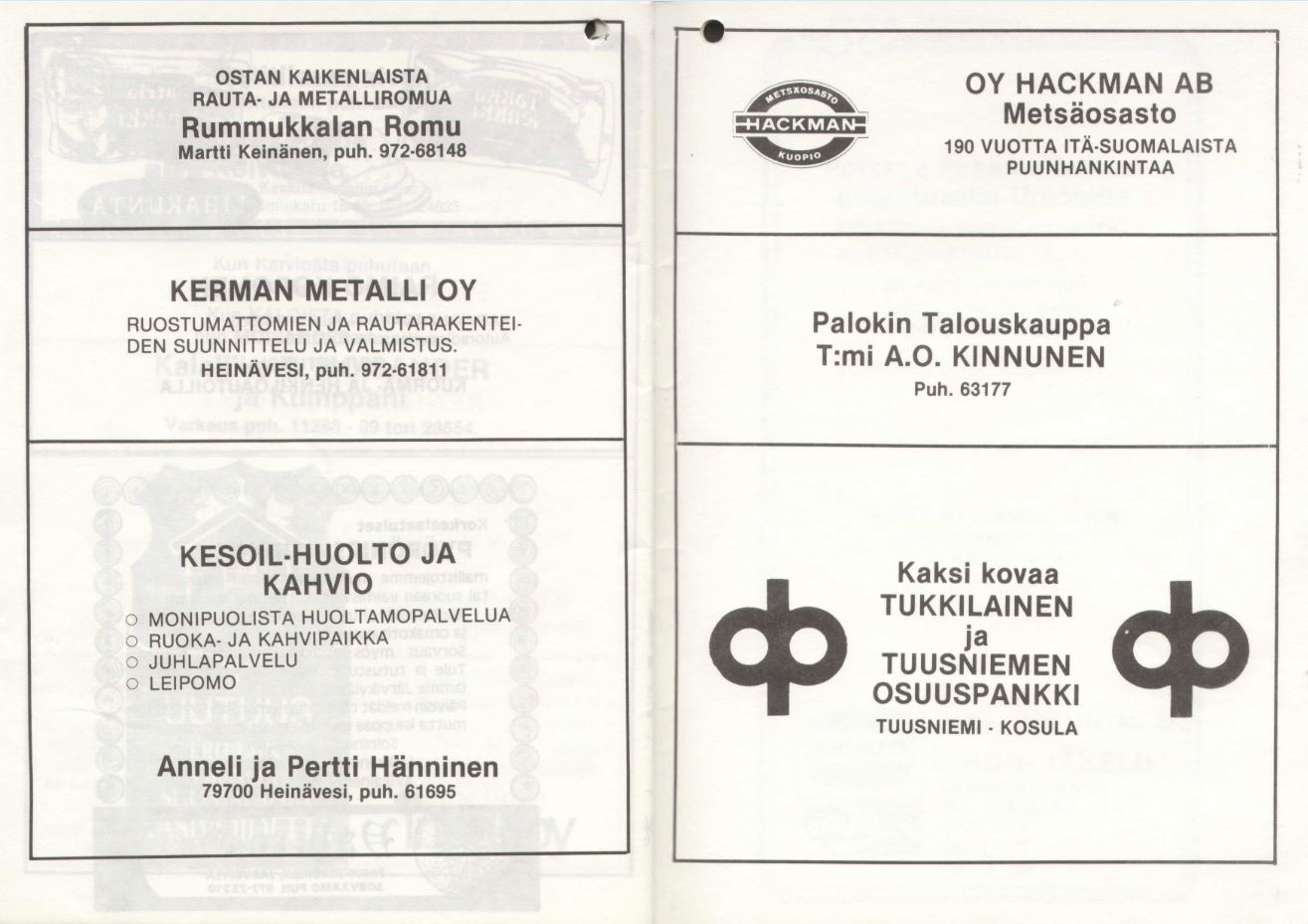 Heinäveden kunnan puolesta toivotan Teidät kaikki, niin kilpailijat, yleisön kuin toimitsijat, tervetulleiksi tänne Heinäveden Karvioon, kauniin kosken partaalle, seuraamaan reippaitten miesten soukeaa leikkiä pölkyn päällä kohisevien kuohujen pärskeessä.